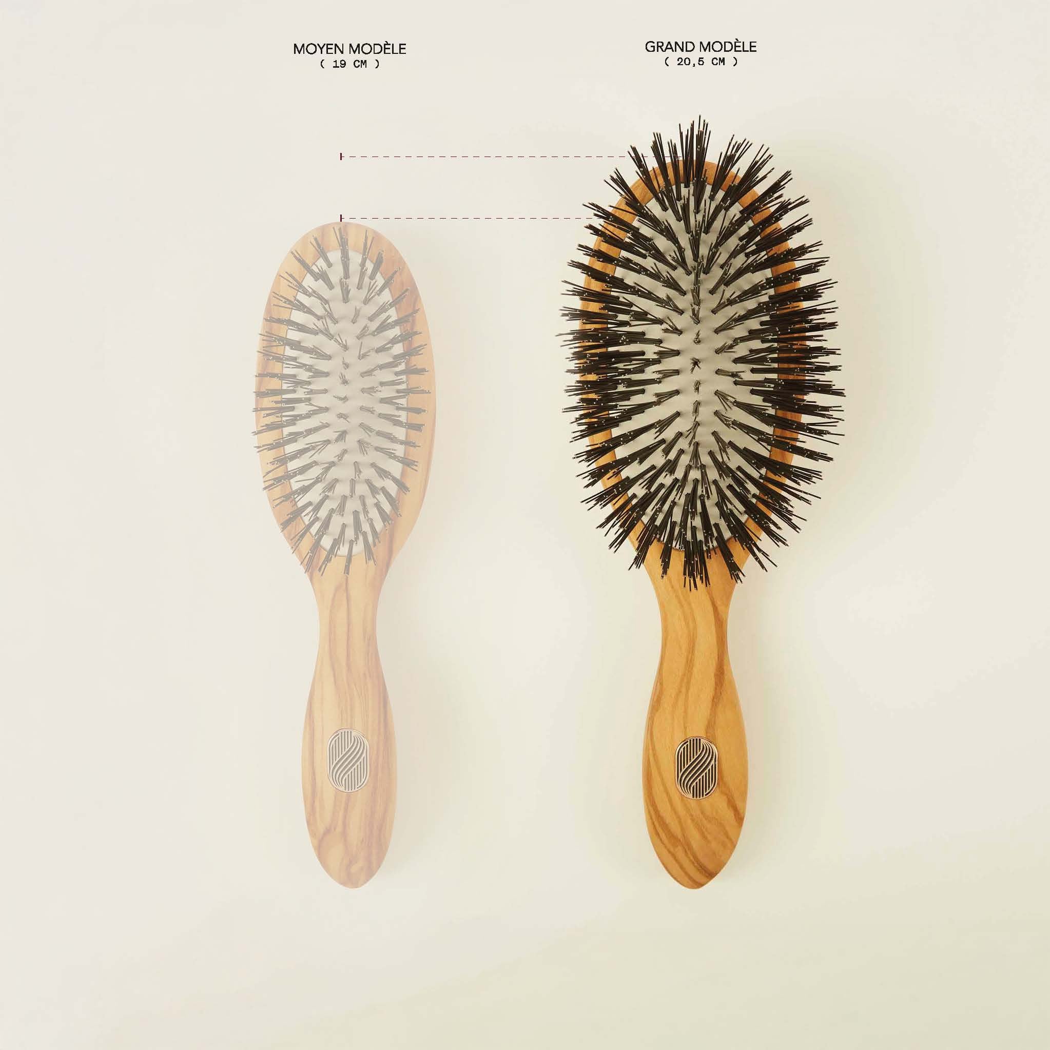 Le but ? Débarrasser le cuir chevelu des impuretés accumulées pendant la journée, mais aussi démêler, hydrater les cheveux et prévenir les nœuds et les frisottis. Et ça tombe bien, puisque plus les cheveux sont secs (et les écailles ouvertes), plus ils ont tendance à s’accrocher entre eux ! Les poils de sanglier ont le pouvoir ultime de capturer le sébum dès la racine pour le répartir sur toute la longueur, et ainsi lisser la fibre pour dompter et gainer la chevelure.