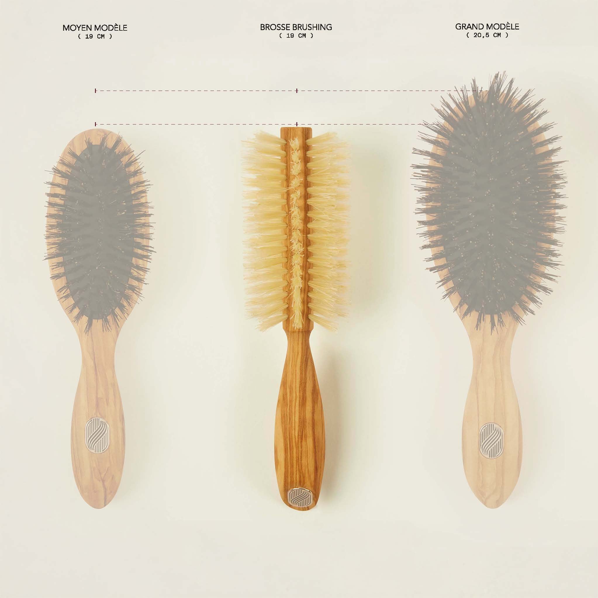 A round boar bristle brush nourishes the hair fiber and brings out its natural shine